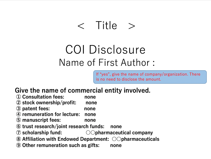 学術集会で演題発表(口演、ポスター 問わず全ての演題)を行う際には、利益相反(conflict of interest:COI)開示が必須となります。筆頭演者の利益相反申告を有無にかかわらず下記の要領で必ずお願いいたします。
