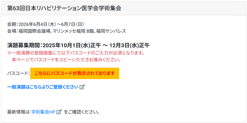 演題登録には会員用パスコードが必要です。会員用パスコードは【会員用Webシステム】内「学術集会(第63回日本リハビリテーション医学会学術集会)」ページに記載がございます。先にメモ等をしていただき、登録ページにて会員用パスコード(必須)を入力してください。 |