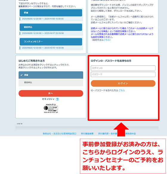 申し込み期間内に、各自で参加登録システムへログインし、ご希望のランチョンセミナーの事前予約を行ってください。