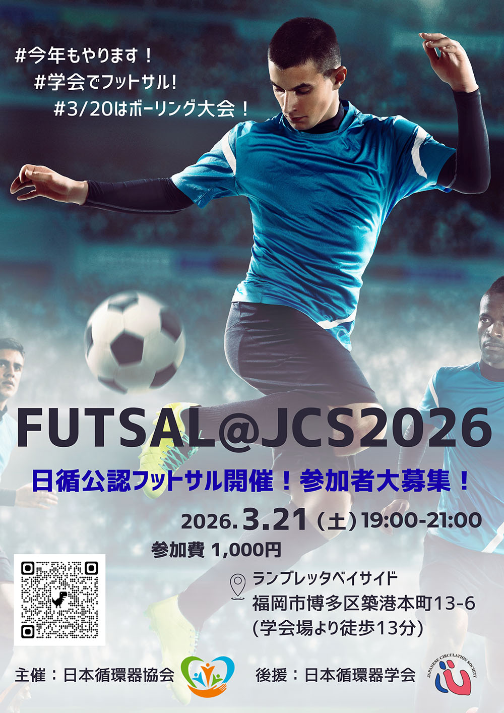 日本循環器協会は、学会2日目の終了後にフットサル大会を開催します。 職種・施設・性別・年齢・人種を問わず、どなたでも参加OK! 個人参加も大歓迎です。 |