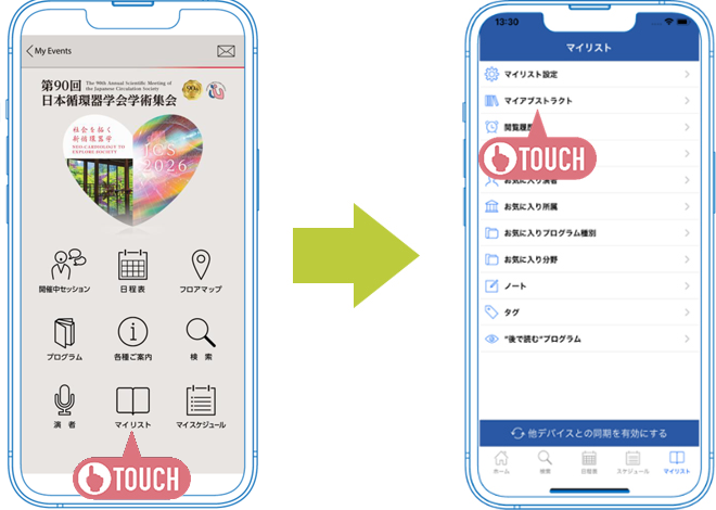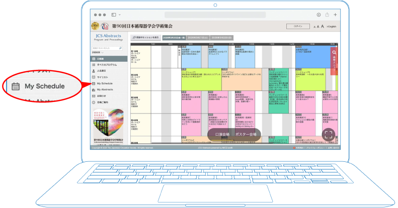 | 「JCS Abstracts」アプリよりお気に入りプログラムのみを収録した「My Abstracts」をPDF形式で生成できます。 |