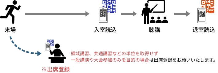 ※領域講習や共通講習にご参加の場合は、出席登録受付で手続きを行わずとも、講演会場に用意されている入場用QRコードを読み込むことで出席登録に代用することが可能です。