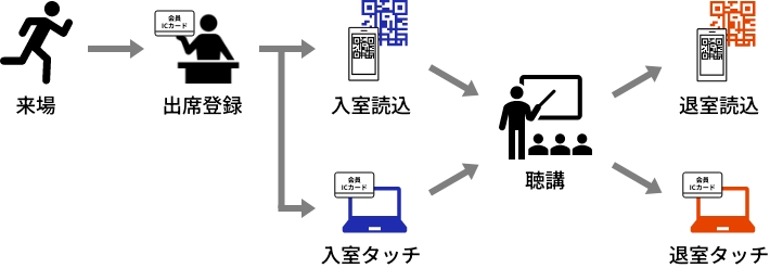 ※会員ICカードをご利用いただく場合は、従来通り事前に現地参加受付にて会員ICカードのタッチによる出席登録が必要となります。