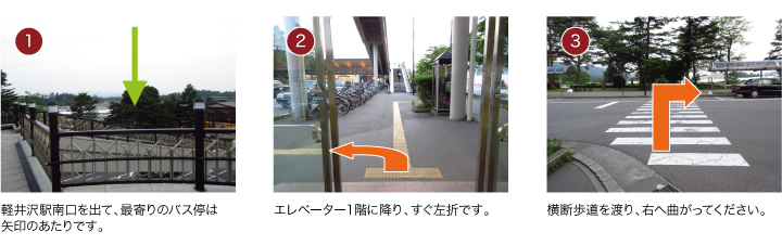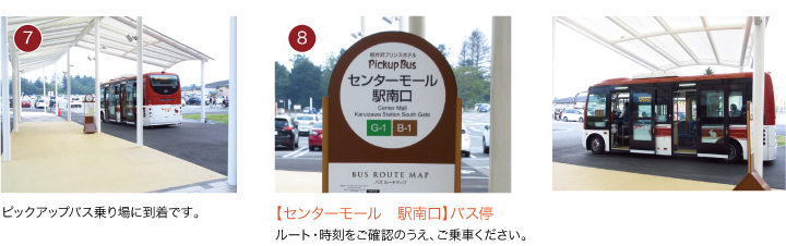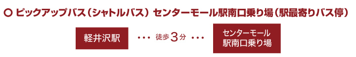 軽井沢駅から徒歩3分にある、センターモール駅南口バス停(B-1)よりホテル施設内各所への無料シャトルバス(ピックアップバス)が運行されています。(8:00A.M.~9:00P.M.、30分間隔)