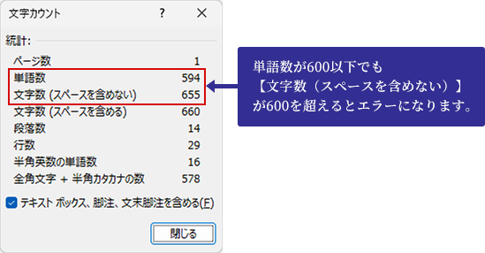 - 演題登録システムでは、Wordの[文字カウント]ダイアログボックスの【文字数(スペースを含めない)】が適用されるため、この数が600を超えるとエラーが表示される仕様となっております。