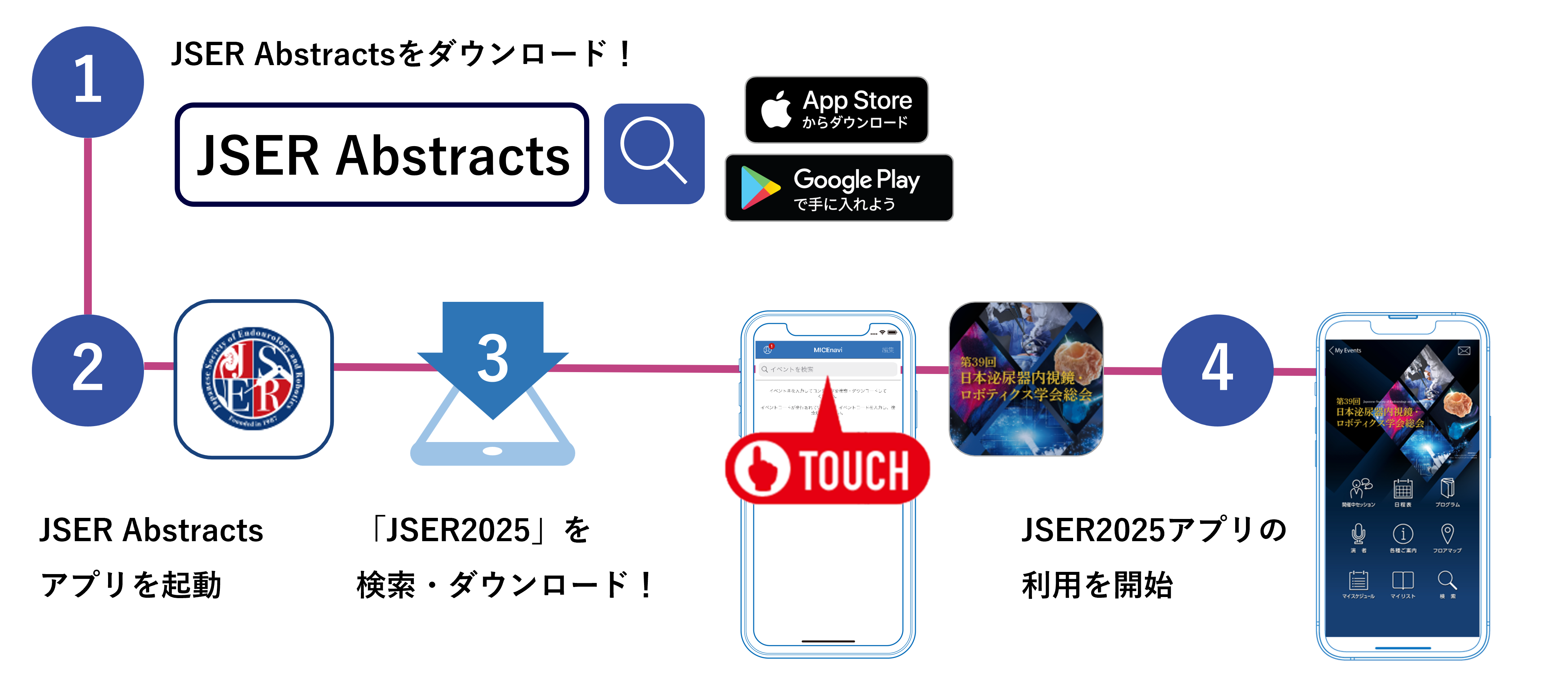 - JSER Abstracts内で「第39回日本泌尿器内視鏡・ロボティクス学会総会」「JSER2025」と検索し、プログラム情報をダウンロードしてください。