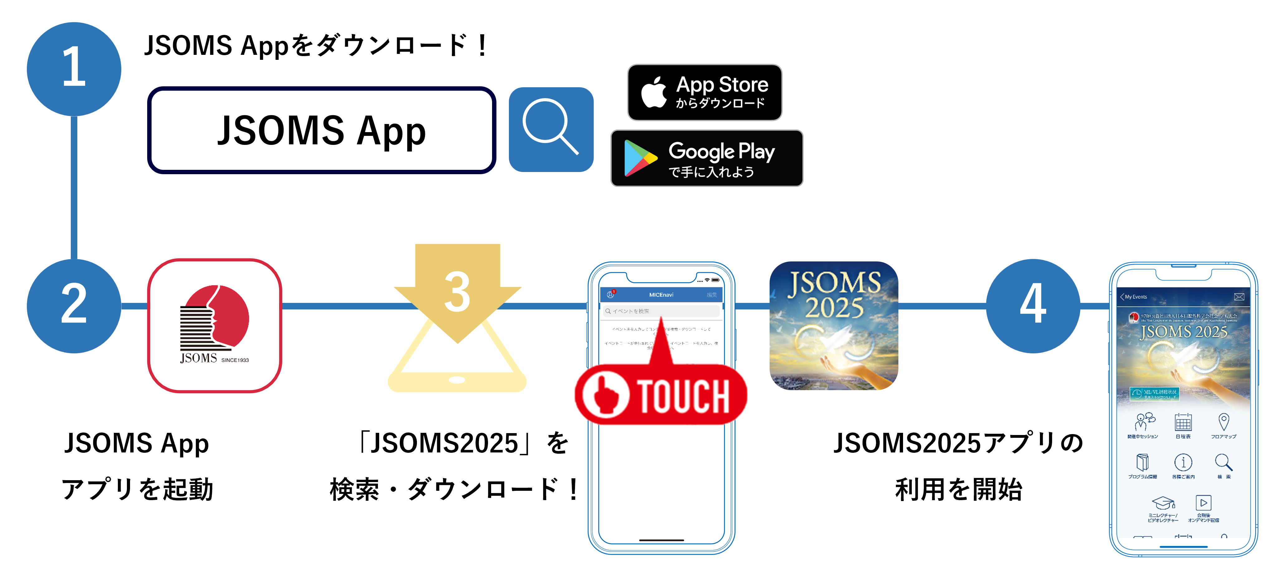 Apple App Store、Google Play Storeから「JSOMS App」を検索し、インストールしてください。 |