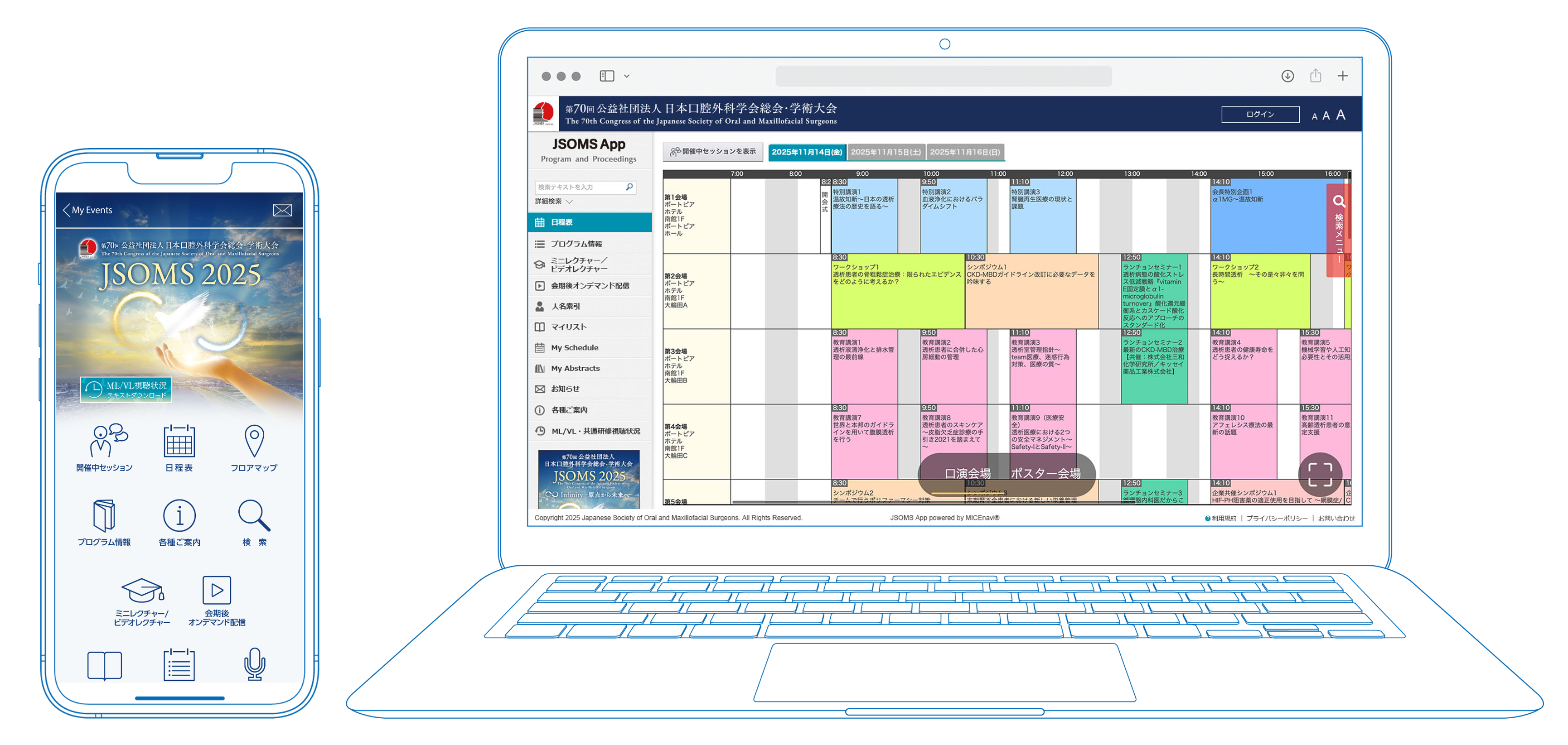 演題検索やスケジュール登録ができる電子抄録サービス「JSOMS App」をご利用いただけます。