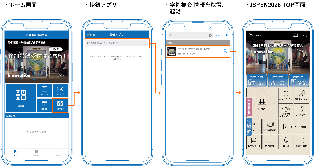 「会員以外の方はこちら」からご利用を開始してください。 - 「JSPEN」アプリ内で「抄録アプリ」を選択し、第41回日本栄養治療学会学術集会(JSPEN2026)のプログラム情報をダウンロードしてください。