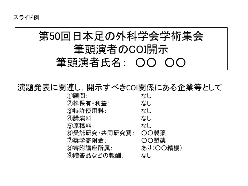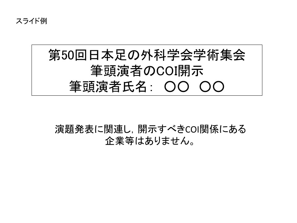 筆頭演者は、スライドの最初に(または演題・発表などを紹介するスライドの次に)、もしくは紙ポスターの最後に、今回の演題発表に関するCOI 状態を開示してください。
